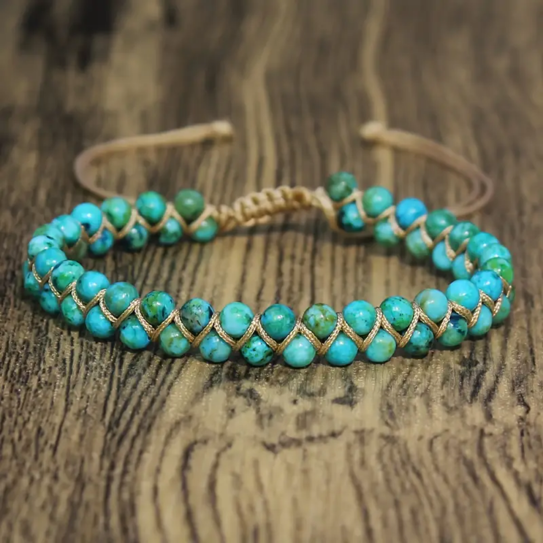 このエレガントなブレスレットは天然ターコイズストーンで作られており、それぞれが独特の青と緑のトーンを引き立てるために金糸で繊細に包まれています。デザインは海の本質を捉え、着用者に安らぎとバランスをもたらします。